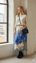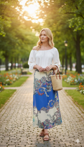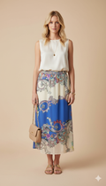 Krem mavi karışımlı karışık renk desenli beli lastikli maxi etek