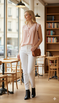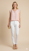 Kolları dantel çiçekli önü püsküllü bağlama detaylı toz pembe bluz