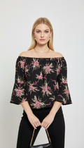 Yakası lastikli siyah üzerine pembe çiçek detaylı truvakar kol bluz