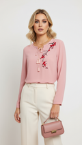 Yanı kırmızı çiçek nakış detaylı önü püskül bağlama pembe uzun kol bluz