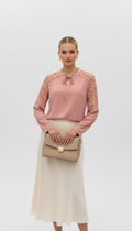 Omuzları çiçek dantel detaylı önü bağlamalı pembe bluz