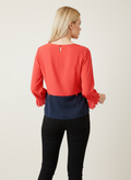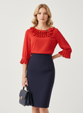 Yakası pile detaylı kırmızı lacivert bluz