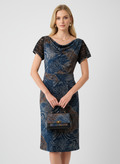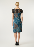 dantel ve pul detaylı karışık desenli kemerli elbise