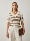 Tek kol kat detaylı v yaka beyaz kahverengi çizgili kazak