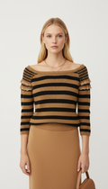 Omuzları kat fırfır detaylı kahve lacivert çizgili kazak