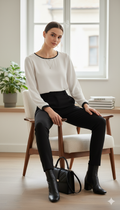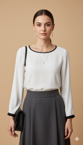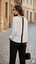 Beyaz yakası siyah ribana geçişli kol uçları ve arkası siyah şerit detaylı uzun kol bluz