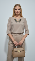 Yakası siyah taş ve gold metal detaylı truvakar kol bluz