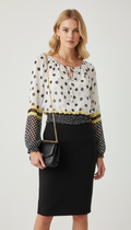 Yakası bağlama detaylı Karışık puantiye detaylı sarı şeritli kolları lastikli şifon bluz