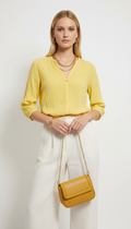 V yaka truvakar kol önü ve yaka uçları gold mini top detaylı sarı bluz