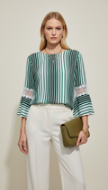 Siyah yeşil çizgili İspanyol kol dirsekleri çiçek dantel detaylı bluz