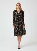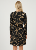 Zincir desenli beli lastikli siyah elbise