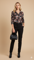 Siyah üzerine nar çiçeği ve beyaz çiçem detaylı truvakar kol mat saten gömlek