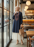 Turuncu etnik desen detaylı önü bağlamalı lacivert tunik