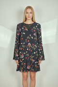 yakası ve kolları transparan dantel detaylı çiçekli siyah elbise